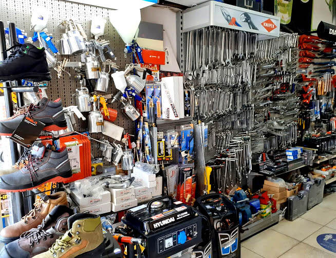 Συγκεκριμένα, στο κατάστημά μας θα βρείτε σιδηρικά, υδραυλικά, ηλεκτρικά εργαλεία, εργαλεία χειρός, βιομηχανικά υλικά, εργαλεία κήπου, βίδες, είδη προστασίας, ναυτιλιακά, χρώματα οικοδομών, αυτοκινήτων, σκαφών και κατασκευών.